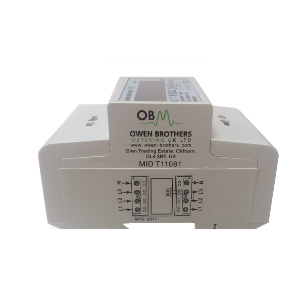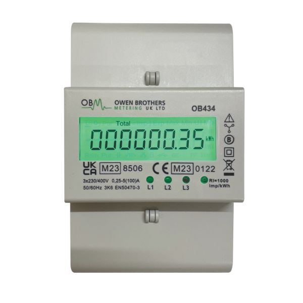 Type: Three-phase 100 A direct connected, kWh pass through meter, active energy, phase voltage indicators, isolated pulsed output, memory back up when power off