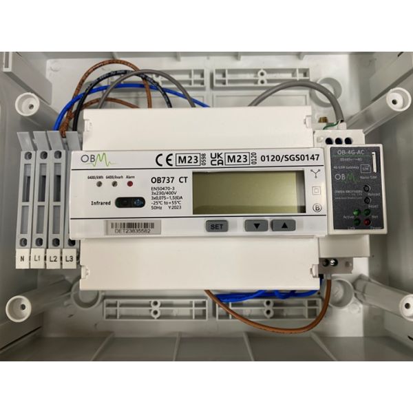 OB737CT MID meter, pre-wired with fuses in a 12 way IP66 polycarbonate enclosure, complete with G6 modem, SIM and a set of 3 split core current transformers to suit - includes user account set up on the obmeters.co.uk platform for accessing the metering data.