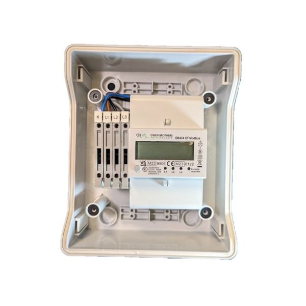 OB434 3 phase CT operated meter pre wired with fuses in a 6 way IP66 polycarbonate enclosure with a frosted window, clipped onto fitted din rail with blanking plates. Current transformers to suit available.