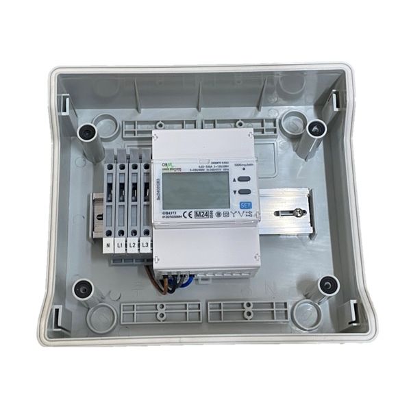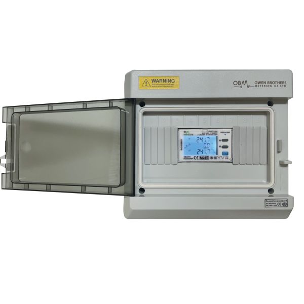 OB4373 three phase CT operated meter pre wired with fuses in a 9 way IP66 polycarbonate enclosure with a frosted window, clipped onto fitted din rail with blanking plates. Current transformers to suit.